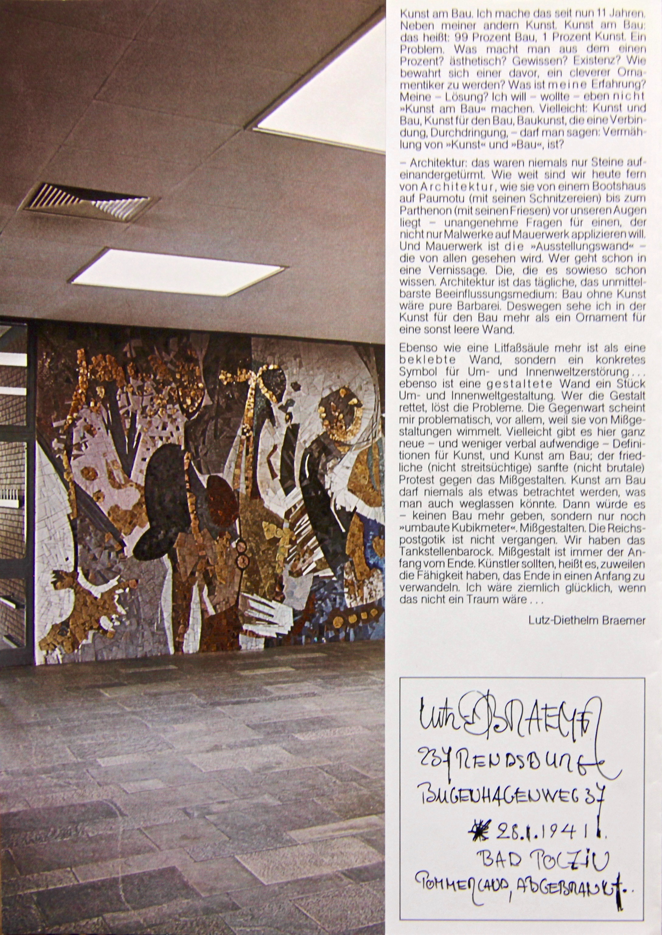 Dem 1975 erschienenen Katalog des BBK-SH zu einer Ausstellung im Brunswiker Pavillon Kiel entnommen: (Kunst am Bau - v. 5.9. bis 27.9.1975)